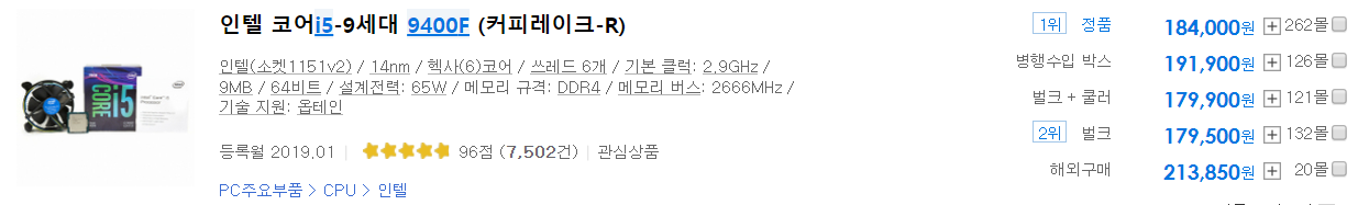 제가 만약 조립컴퓨터를 제작한다면 2만원더 지불하고 i5 9400F를 구매할것 같네요.