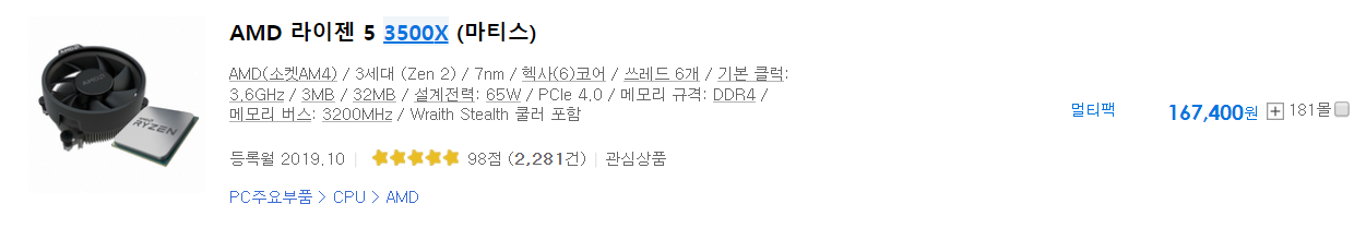 오히려 Ryzen5 3500X가 20000원 가량 더 저렴합니다.