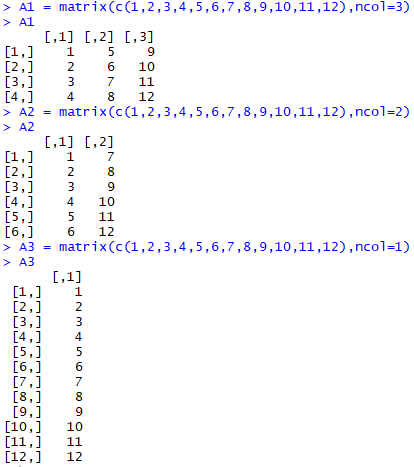 A1 = matrix(c(1,2,3,4,5,6,7,8,9,10,11,12),ncol=3)