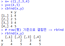 cbind(x,y)로 결합한결과 x,y가 열 기준으로 구성된것을 확인할수 있습니다.