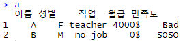 [1] "이름" "성별" "직업" "월급" "만족도"