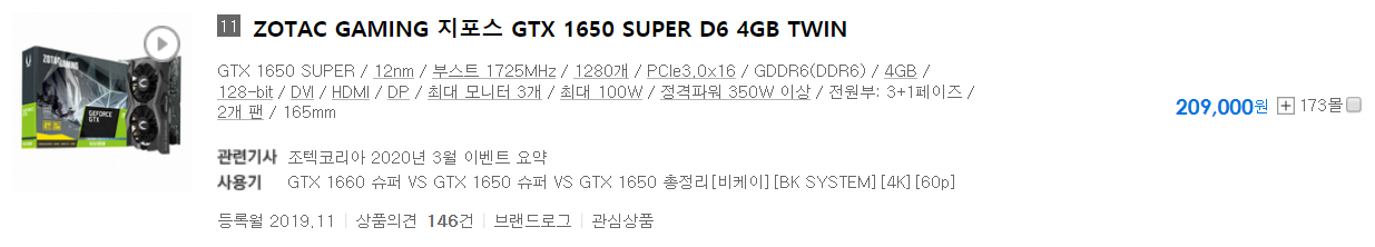 이어서 GTX1660 SUPER 모델은 다나와 기준 209,000원의 가격으로 최저가가 올라와있네요.