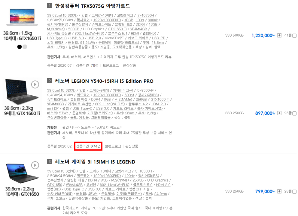 6. 다나와 기준 게이밍 노트북 순위 2위 + 상품의견 674개, 즉 많은 사람들이 구매한 노트북임