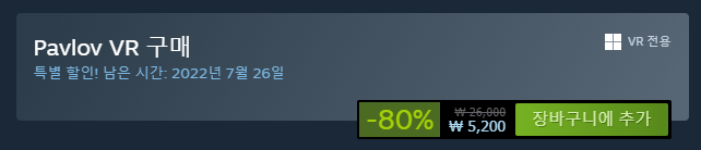 현재 Pavlov(파블로브) VR의 가격은 정가 26000원 -> 할인가 5200원으로 80% 정도의 할인율을 보여주고 있기에 할인기간에 하나 쟁여두기 좋은 게임입니다..