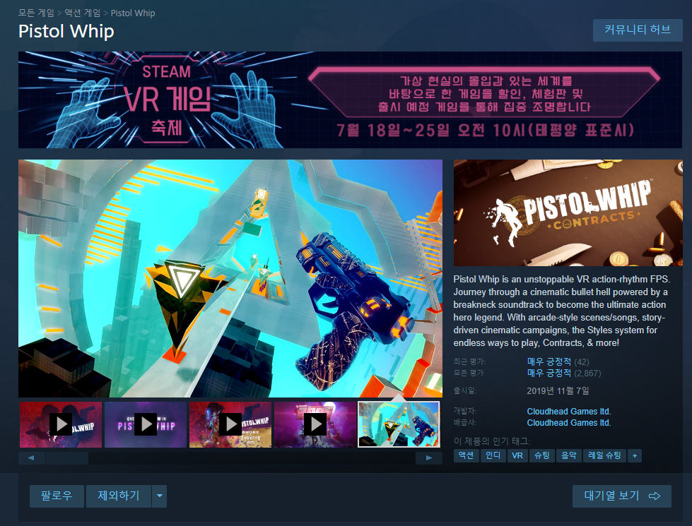 Pisol Whip(피스톨 휩)은 정가 31000원 할인가 기준 20150원으로 35%의 할인율을 보여주고 있습니다. 전 평소 해보고싶었던 게임이기에 위에 적혀있는 게임들에 비해 낮은 할인율이지만 구매를 했습니다. 상당히 기대가 되는 게임입니다.