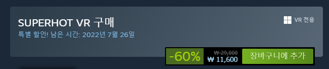 SUPERHOT(슈퍼핫) VR의 경우 정가 29000원에서 할인가 11600원으로 60% 정도의 할인율을 보여주고 있는데 이 정도면 합리적으로 구매할만한 가격대라고 생각합니다.