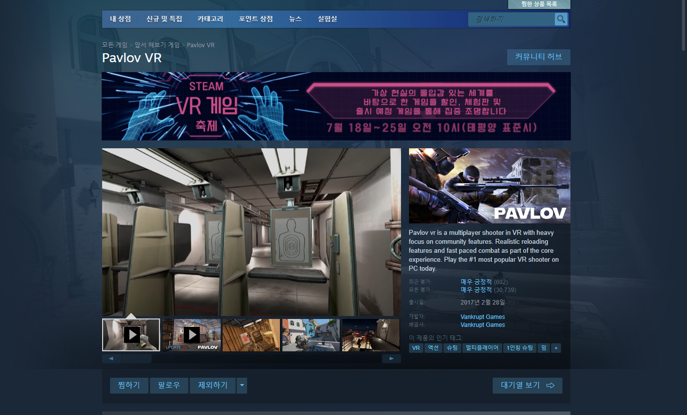 개인적으로 파블로브를 플레이 해보았었는데 총기도 리얼하고 진짜 전장에서 싸우는 느낌이 많이들어서 정말로 추천드립니다. VR판 FPS 3대장에 속하는 게임인 만큼 적극적으로 구매를 추천드립니다.