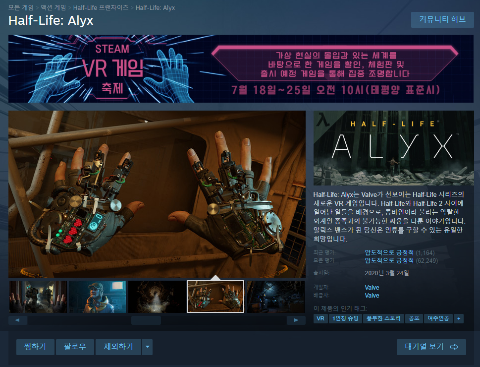 현재 하프라이프 알릭스는 50% 할인하여 30500원에 판매되고 있는데 평소에 관심 있으셨던 분들은 구매할만한 가격인것 같습니다.