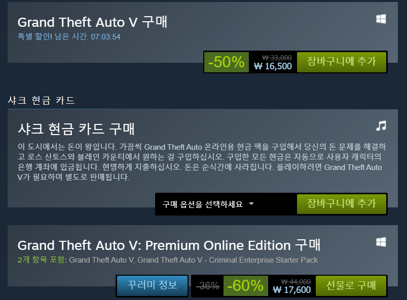 GTA5 온라인에디션 또한 할인하지 않을경우에는 44000원 정도하네요.